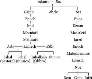 La Bibbia I testi antichi di musica rimandano l'origine della musica a Iubal, personaggio biblico, sesto discendente di Caino.[17] Ora Caino si unì alla moglie che concepì e partorì Enoch; poi divenne costruttore di una città, che chiamò Enoch, dal nome del figlio. [18] A Enoch nacque Irad; Irad generò Mecuiaèl e Mecuiaèl generò Metusaèl e Metusaèl generò Lamech. [19] Lamech si prese due mogli: una chiamata Ada e l'altra chiamata Zilla. [20] Ada partorì Iabal: egli fu il padre di quanti abitano sotto le tende presso il bestiame. [21] Il fratello di questi si chiamava Iubal: egli fu il padre di tutti i suonatori di cetra e di flauto. [22] Zilla a sua volta partorì Tubalkàin, il fabbro, padre di quanti lavorano il rame e il ferro. La sorella di Tubalkàin fu Naama. (Genesi, 4) In realtà nel capitolo successivo della Genesi, si narra della discendenza di Set, fratello di Caino, che sembra molto simile alla precedente (il padre di Noè ha lo stesso nome del padre di Iubal). In pratica: