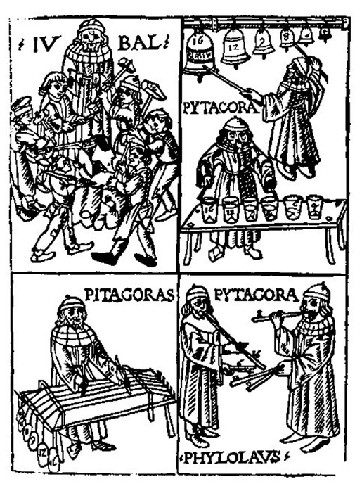 exquisitam. Percioché (come dicono Mosè, Gioseffo, et Beroso Caldeo) avanti che fusse il diluvio universale [la scienza della musica] fu al suono de' martelli trovata da Iubale della stirpe di Caino. Mosè, ricordato quale autore del Pentateuco, è in effetti fonte autorevole, non solo come profeta ma in quanto musico: numerosi salmi e soprattuto il Cantico di Mosè, celebrato fra i più riusciti del Vecchio Testamento e intonato in lode al Signore con strumenti e balli (Esodo 15,1 ss.), lo pone fra i primi compositori della storia, e primissimo della cultura ebraica. Il passo a cui si riferiscono Gaffurio e Zarlino (Genesi 4,21) dice:Il fratello di questi [di Iabal] si chiamava Iubal: egli fu il padre di tutti i suonatori di cetra e di flauto ["cithara et organo" secondo la Vulgata]. Il riferimento ai martelli è al versetto successivo:Zilla a sua volta partorì Tubalkain, il fabbro, padre di quanti lavorano il rame e il ferro. Iubal e Tubalkain (Vulcano) erano quindi fratellastri, l'uno musico, l'altro fabbro.Anche Giuseppe Flavio (37 - post 103), storico ebreo di lingua greca, nelle Antichità giudaiche (20 libri) si limita a ripetere la Genesi precisando semmai che il fratellastro fu anche valoroso guerriero, attività dalla quale sapeva trarre piacere personale: Jubal, figlio della stessa madre [Ada], coltivò la musica e inventò il salterio e la citara. Jubel [altra versione del nome di Tubalkain], uno dei figli dell'altra moglie [Zilla ovvero Sella], superava tutti per forza, si distinse nell'arte della guerra con valore, e da questa traeva quanto soddisfa i piaceri del corpo, e fu il primo che inventò la lavorazione dei metalli. [I, § 64] Beroso (citato solo da Zarlino), storico babilonese del IV-III sec. a.C. ripete in buona sostanza Giuseppe Flavio.Che ci possa essere una relazione fra i martelli di Tubalkain e la musica di Iubal è in realtà una sovralettura che intreccia il dettato biblico con un episodio tradizionalmente riferito a Pitagora. L'episodio, che poi diverrà celeberrimo, è quello ricordato da Giamblico (250-325) nella sua Vita di Pitagora: mentre passava dinanzi all'officina di un fabbro, per sorte divina udì dei martelli che, battendo il ferro sopra l'incudine, producevano echi in perfetto accordo armonico tra loro, eccettuata una sola coppia. Egli riconobbe in quei suoni gli accordi di ottava, di quinta e di quarta e notò che l'intervallo tra quarta e quinta era in se stesso dissonante ma tuttavia atto a colmare la differenza di grandezza tra i due. Rallegrato che con l'aiuto di un dio il suo proposito fosse giunto a compimento, entrò nell'officina e dopo molto prove scoperse che la differenza nell'altezza dei suoni dipendeva dalla massa dei martelli ... In pratica, prosegue Giamblico, se la differenza dei martelli era doppia, 1 a 2, il suono prodotto era l'ottava, se 2 a 3 la quinta, se 3 a 4 la quarta, se 8 a 9 il tono. S'accorse così che con quattro martelli in rapporto di 6, 8, 9 e 12 si potevano ottenere tutti i rapporti ascoltati nell'officina e i relativi intervalli.Che Gaffurio bene conoscesse la scoperta di Pitagora lo si evinge dall'incisione riprodatta nella sua Theorica musice: