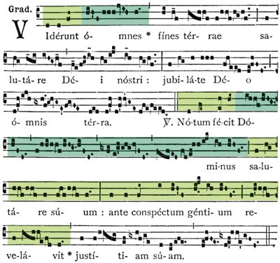 Nell'esempio che segue si mostra, mediante l'applicazione della tecnica polifonica, l'esecuzione del graduale per la messa di Natale Viderunt omnes.