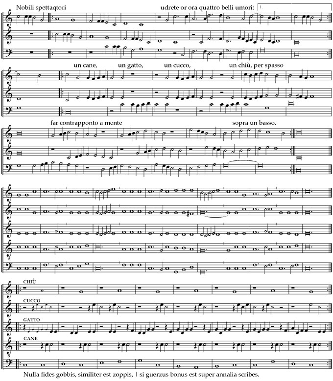 «Alla mente» significa improvvisato, a sottolinearne la semplicità. I versi che canta il basso riprendono una frase tratta dal Baldus di Teofilo Folengo (1491-1594):