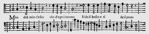 Tutta la prima scena del II atto dell'Orfeo (fino all'ingresso della Messaggiera che annuncia la morte di Euridice) si racconta la gioia di Orfeo fra i suoi pastori. Le quartine di Striggio sono organizzate secondo una continua mutazione di mensura:
