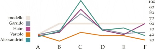 Il diagramma che segue mostra il valori in relazione all'agogica di riferimento. A parte Vartolo, gli altri seguono, seppur con auspicabili differenze, quello che è la tradizione esecutiva attuale, dove l'episodio C è sostanzialmente frainteso (che il tempo sia lento lo si comprende anche dal testo: è qui che «Pan ... dolente» ricorda gli «sventurati amori»):