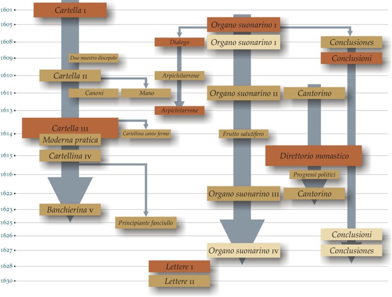 Sulla base dello schema, Lettere a parte, s'individuano due grandi nuclei: la Cartella (didattica per il futuro maestro di cappella) e l'Organo (liturgico per l'organista). Di quest'ultimo gruppo, pur derivati, i rami laterali (Dialogo, Arpichitarrone e Conclusioni) sono più interessati all'esecuzione alla tastiera.
