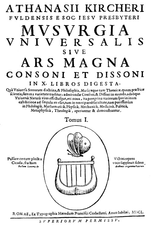 [frontespizio] Di Atanasius Kircher, sacerdote gesuita di Fulda, la Musurgia universale, ovvero la grande arte della consonanza e della dissonanza, divisa in dieci libri, Dove l'universale dottrina e la filosofia del suono, nonché la scienza musicale, teorica e pratica, si espongono nelle loro varietà; e si svelano e dimostrano le forze e gli effetti stupefacenti delle consonanze e dissonanze del mondo e della natura infinita, con nuova e ricercata esposizione di casi diversi, e specifiche applicazioni nell'ambito pressoché di ogni disciplina, e soprattutto in filologia, matematica, fisica, meccanica, medicina, politica, metafisica e teologia. Tomo I Pulsare certant plectra | cicada, fractam Victori repens | voce supplevit fidem Roma, nella tipografia degli eredi di Francesco Corbelletti, nell'anno del Giubileo 1650. Con il permesso dei superiori.