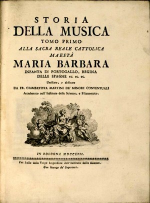Padre Martini programmò la sua Storia della musica in 5 volumi, coprendo tutto l'arco della storia umana, dalla creazione dell'uomo fino ai suoi giorni, ma non riuscì ad andare oltre la musica dei greci; il primo volume fu pubblicato nel 1757, il secondo nel 1770 e il terzo nel 1781; il quarto e il quinto avrebbero dovuto trattare l'epoca medievale e la moderna.