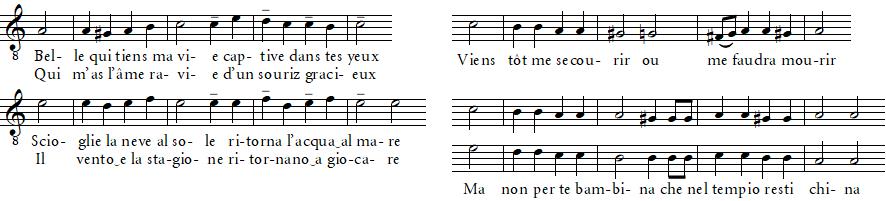 | Belle, qui tiens ma vie | captive dans tes yeux qui m’as l’âme ravie | d’un souris gracieux viens tôt me secourir | ou me faudra mourir |