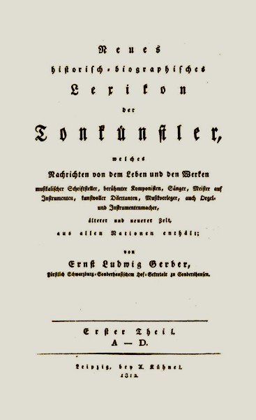 1812-1814 · II edizione Ernst Ludwig Gerber, Neues historisch-biographisches Lexikon der Tonkünstler welches Nachrichten von dem Leben und den Werken musikalischer Schriftsteller, berühmter Komponisten, Sänger, Meister auf Instrumenten, kunstvoller Dilettanten, Musikverleger, auch Orgel- und Instrumentenmacher, älterer und neuerer Zeit, aus allen Nationen enthält, 4 voll., Leipzig: A. Kühnel, 1812-1814. |