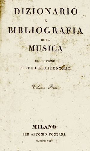 1826, 1836 - I ed. e rist. Peter (Pietro) Lichtenthal, Dizionario e bibliografia della musica, Milano: Antonio Fontana, 1826, 21836. |