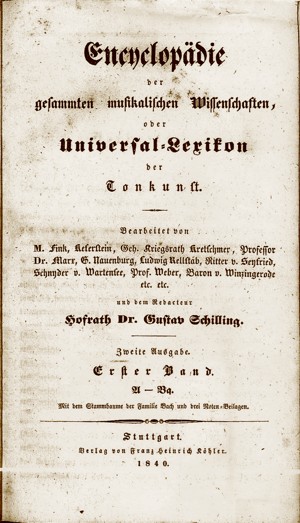 1835-1838 - I edizione. in 6 voll. e ristt. (1840 e 1841) Encyklopädie der gesammten musikalischen Wissenschaften, oder Universal Lexicon der Tonkunst. Bearbeitet von M. Fink, Keferstein, Geh. Kriegsrath Kretschmer, Professor Dr. Marx, G. Nauerburg, Ludwig Rellstab, Ritter von Seyfried, Schnyder von Wartensee, Prof. Weber, Baron v. Winzingerode etc. etc. und dem Redacteur Hofrath Gustav Schilling ... Mit dem Stamm-baume der Familie Bach und drei Noten-Beilagen, 6 voll. a cura di Gustav Schilling, Stuttgart: Franz Heinrich Köhler, 1834-1838, 21840, 31841. |