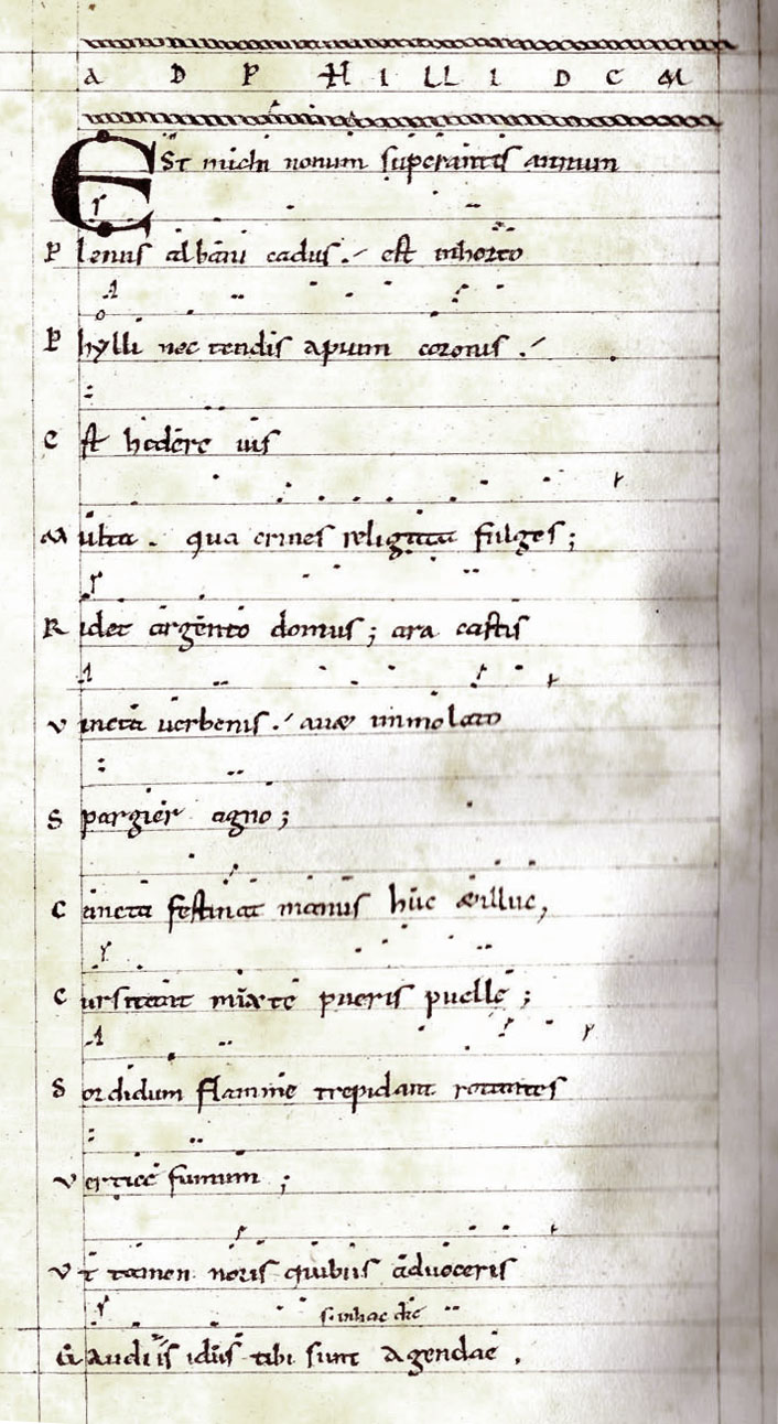 | Laudibus cives \ celebrant superni te, Deus simplex \ pariterque trine, supplices ac nos \ veniam precamur | parce redemptis. |
